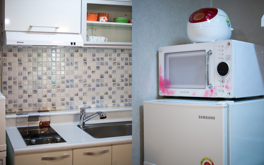 TV, 에어컨, 냉장고, 화장대, 에어컨, 전기밥솥, 전자렌지, 인덕션레인지, 전기주전자, 식탁, 취사도구일체, 와인잔, 드라이기, 바디클렌져, 수건, 샴푸, 린스, 치약